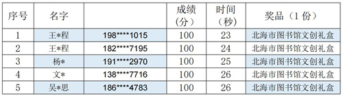 北海市图书馆举办的“庆元旦迎新品读经典”——竞猜好书线上活动。已经于2024年1月20日0点结束,恭喜以下读者成为获奖者: